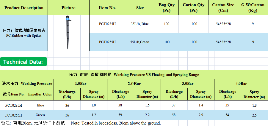Adjustable flow and range for different purpose:Sprinkling irrigation, drip irrigation or shut down. Different spray form for different plants: radial type and centrifugal type.